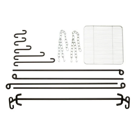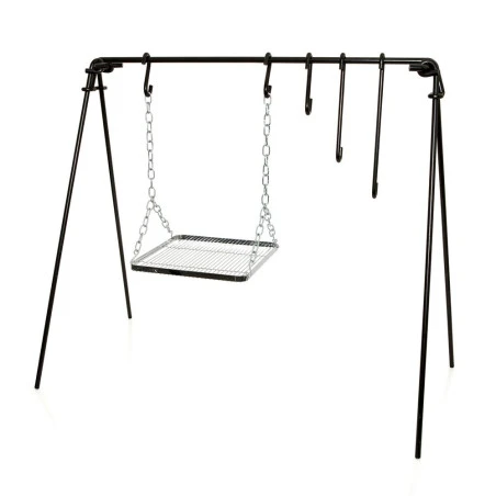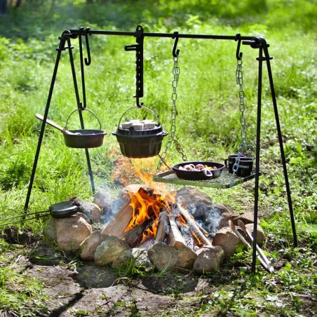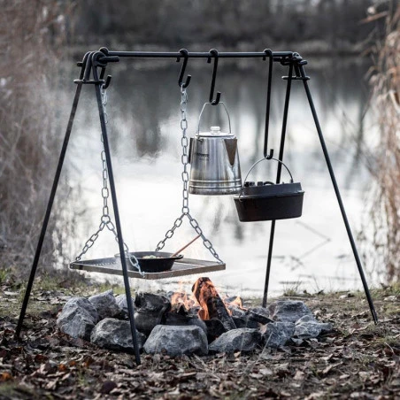 Le Pont de Chauffe, grâce Ă sa construction Ă quatre pieds, assure une utilisation sĂ©curitaire et peut ĂŞtre prĂŞt en un rien de temps. Avec une barre transversale de 115 cm de long, vous pouvez cuisiner sur un ou plusieurs foyers. Les trois crochets de diffĂ©rentes longueurs vous permettent d’accrocher des marmites en fonte, des bouilloires et des cruches Ă diffĂ©rentes hauteurs au-dessus du feu. La hauteur du gril est rĂ©glable grâce Ă une chaĂ®ne. Les rebords tout autour maintiennent les aliments et les ustensiles en toute sĂ©curitĂ©. Avec cette cuisine extĂ©rieure professionnelle, la prĂ©paration de repas de camping et trappeur Ă plusieurs services ne sera plus un dĂ©fi pour vous et vos amis.